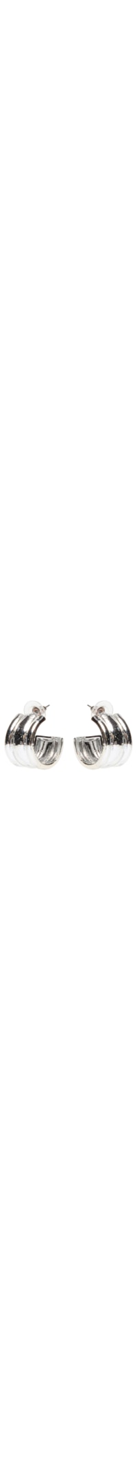 O brinco prateado é produzido em metal. A peça de modelo argola possui tamanho pequeno, espessura grossa, recortes em baixo-relevo e fechamento posterior por tarraxa.