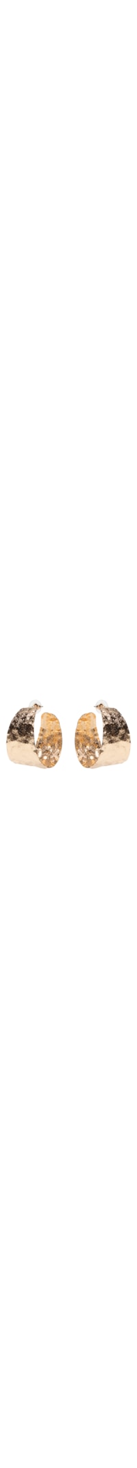 O brinco dourado é produzido em metal. A peça possui tamanho grande, formato meia-lua, superfície texturizada, acabamento martelado e fechamento posterior por tarraxa.