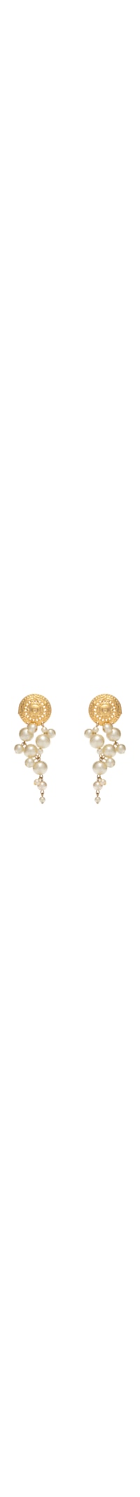 O brinco dourado é produzido por metal com banho de ouro 18k. A peça possui tamanho médio, formato irregular, aplicações em pérolas, acabamento polido e fechamento por pressão posterior.