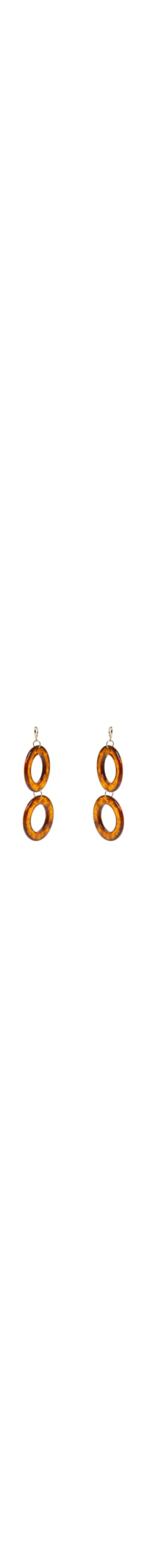 O brinco marrom é produzido em resina. A peça possui comprimento alongado, círculos grandes com recorte vazado no centro unidos por contra argola metálica, superfície translucida com efeito tartaruga e fechamento por encaixe.