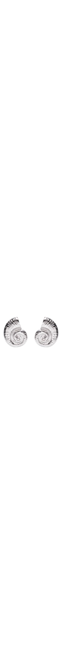 O brinco prateado é produzido em metal. A peça possui tamanho médio, espessura fina, formato figurativo de concha, superfície texturizada, acabamento polido e fechamento posterior por tarraxa.