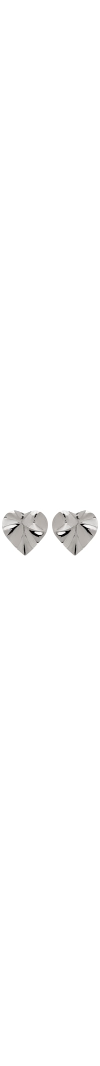 O brinco prateado é produzido em metal. A peça possui tamanho médio, formato figurativo de coração, acabamento martelado e fechamento posterior por tarraxa.