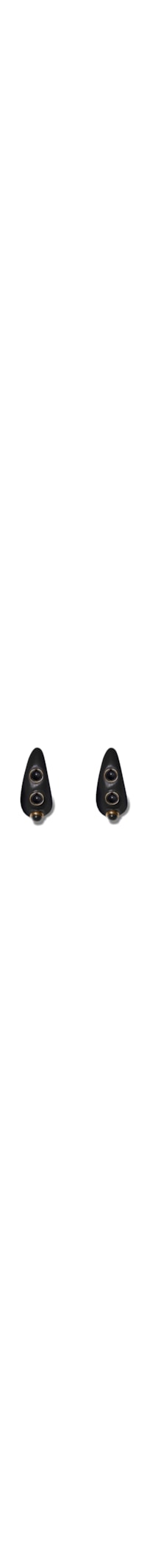 O brinco preto é produzido em resina. A peça de modelo argola possui tamanho médio, espessura assimétrica, aplicação de esferas em cor contrastante com base metálica na parte externa e fechamento posterior por tarraxa metalizada.