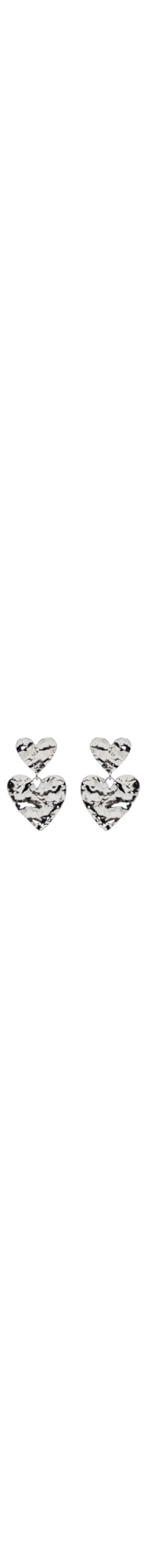 O brinco prateado é produzido em metal. A peça possui tamanho médio, espessura fina, formato figurativo de corações duplos, acabamento martelado e fechamento posterior por tarraxa.