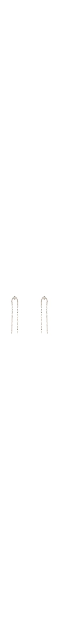 O brinco prata é produzido em metal com banho em platina. A peça possui tamanho médio alongado, formato ferradura com efeito chanfrado, aplicação inferior de correntes cadeadas e fechamento posterior por tarraxa.