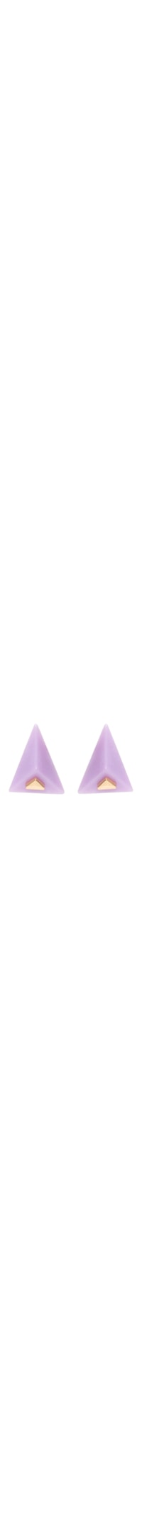 O brinco lilás é produzido em resina levemente marmorizada. A peça possui tamanho médio, formato triangular, aplicação metálica geométrica e fechamento posterior por pressão.