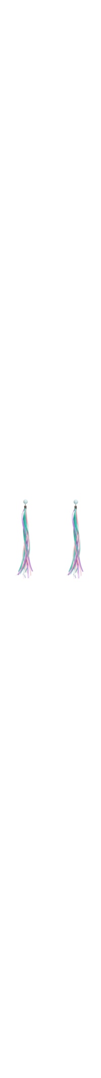 O brinco azul é produzido em metal. A peça possui tamanho grande, base redonda com esfera em cor contrastante, fitas de cetim alongadas em cores contrastantes e fechamento posterior por tarraxa.