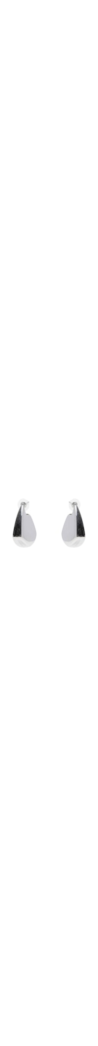 O brinco prateado é produzido em metal. A peça possui espessura média, formato geométrico, acabamento polido e fechamento posterior por tarraxa.