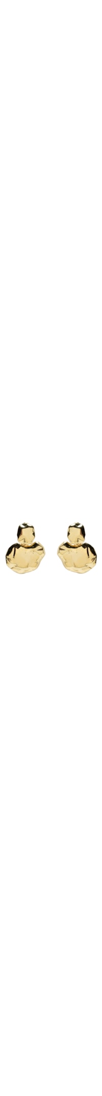 O brinco dourado é produzido em metal com banho de ouro 18K. A peça possui tamanho médio, duas esferas de formato orgânico e assimétrico com tamanhos distintos, acabamento polido e fechamento posterior por tarraxa.