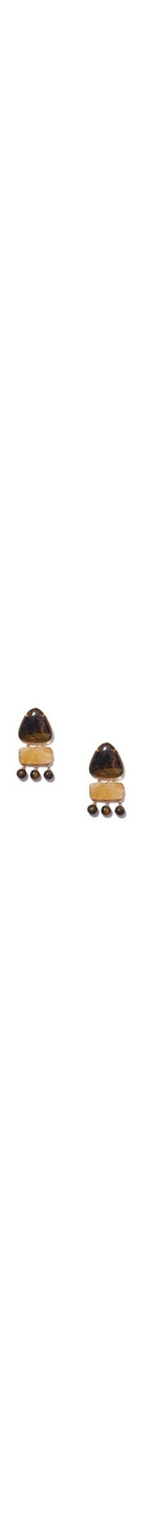 O brinco marrom é produzido em resina com efeito marmorizado. A peça possui comprimento alongado, formato assimétrico, base em metal com banho de ouro, pingentes fixo aplicado na parte inferior com formato retangular e arredondado, acabamento polido e fechamento posterior por presilha de pressão.