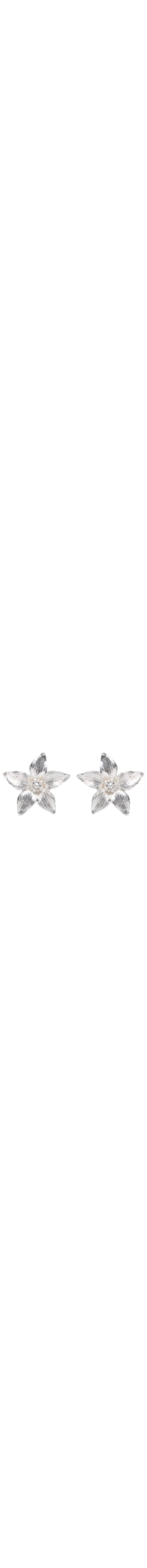 O brinco prateado é produzido em metal. A peça possui tamanho médio, formato figurativo de flor, acabamento texturizado e fechamento posterior por tarraxa.