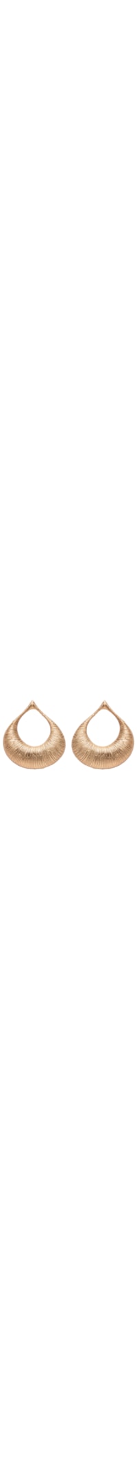 O brinco dourado é produzido em metal. A peça possui tamanho médio, formato de gota, detalhe vazado, acabamento escovado e fechamento posterior por tarraxa.