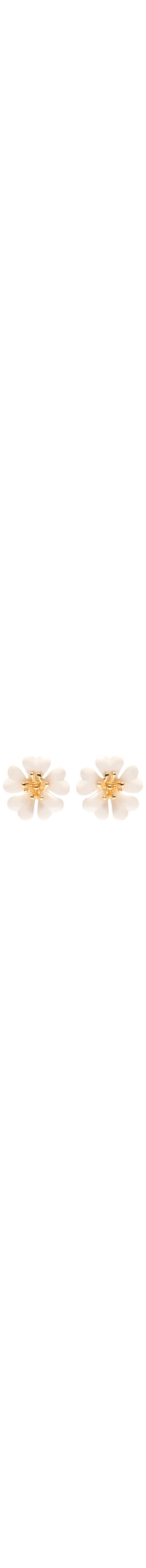 O brinco bege é produzido em metal. A peça possui tamanho médio, formato figurativo em flor, aplicação central em relevo, acabamento polido e fechamento por tarracha.