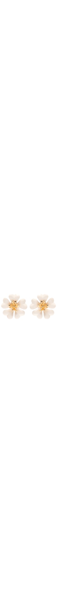 O brinco off white é produzido em metal com pintura automotiva antialérgica. A peça possui tamanho médio, formato figurativo de flor, detalhe de aplicação na parte central com formato orgânico e banho de ouro, acabamento polido e fechamento posterior por tarraxa.