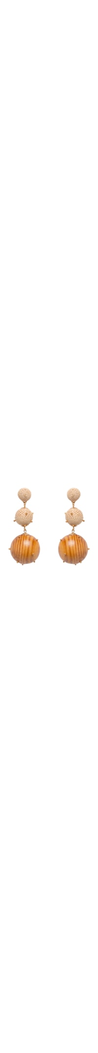 O brinco bege é produzido em palha. A peça possui tamanho grande, esferas de tamanhos distintos com superfície em palha trançada e aplicações metalizadas, esfera inferior em madeira de cores contrastantes com aplicações metalizadas e fechamento posterior por tarraxa.