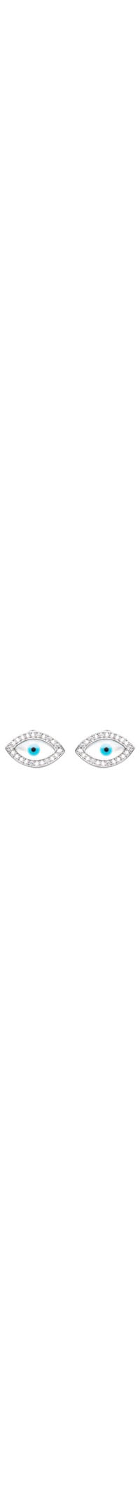 O brinco prata é produzido em metal. A peça possui tamanho pequeno, formato figurativo de olho, bordas com aplicação de strass, parte central resinada com detalhe de olho grego em cores contrastantes, laterais com recortes vazados e fechamento posterior por tarraxa.