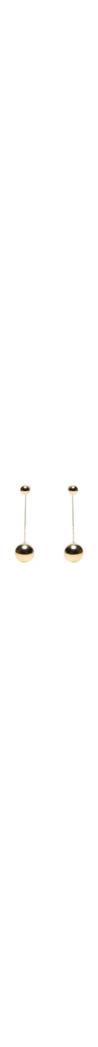 O brindo dourado é produzido em metal com banho de ouro 18K. A peça possui tamanho grande, formato alongado, parte superior com esfera pequena aplicada, corrente de elos entrelaçados com aplicação de esfera média removível por argola na parte posterior, acabamento polido e fechamento posterior por tarraxa.