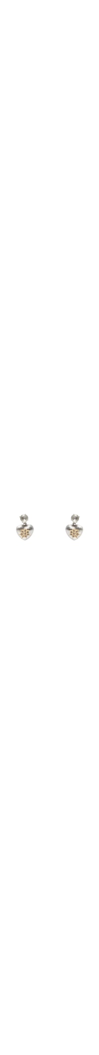 O brinco prateado é produzido em metal. A peça possui tamanho pequeno, formato figurativo de coração, superfície com aplicações de pingente dourado em formato de estrela, aplicação de strass e fechamento posterior por tarraxa.