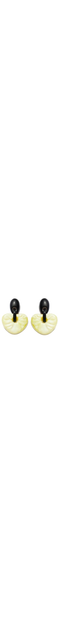 O brinco amarelo é produzido em resina. A peça possui tamanho médio, formato arredondado com perfuro com aplicação de argola com espessura média e com acabamento fosco, aplicação de pingente com formato figurativo de coração com detalhe de linhas em baixo-relevo, acabamento polido e fechamento posterior por tarraxa.