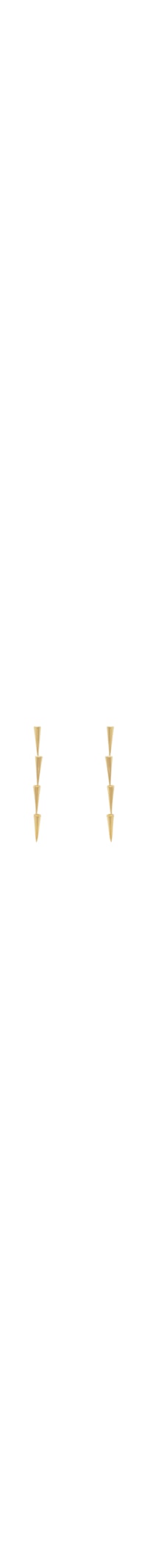 O brinco dourado é produzido em metal com banho de ouro 18K. A peça possui tamanho grande, comprimento alongado, cones metálicos alongados, acabamento polido e fechamento posterior por tarraxa.