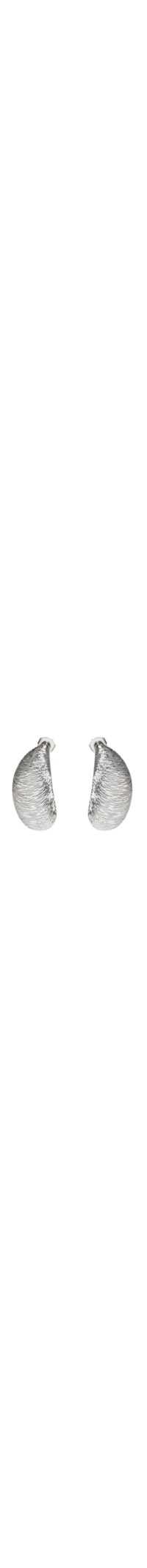 O brinco prateado é produzido em metal A peça possui formato assimétrico levemente curvado, design escultural e fechamento posterior com pino e tarraxa metálica.