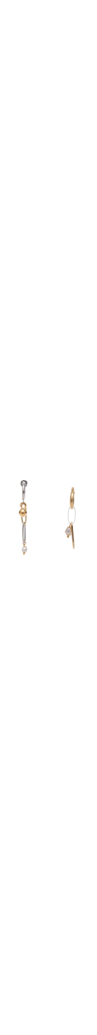 O brinco dourado é produzido em metal com banho de ouro e platina. A peça possui comprimento alongado, lados assimétricos com mix de banhos, argolas médias de espessura fina, aplicações de aviamentos metálicos ovalados, pingentes em pérolas naturais e pingente esférico, acabamento polido e fechamento por tarraxa e encaixe.