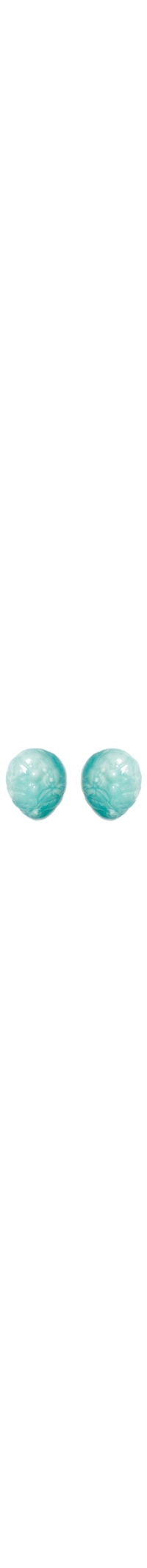 O brinco azul é produzido em resina com superfície texturizada. A peça possui tamanho médio, formato arredondado com superfície irregular, detalhe translúcido, acabamento polido e fechamento posterior por presilha de pressão.