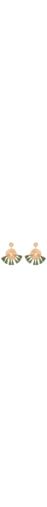 O brinco bege é confeccionado em palha. A peça possui tamanho médio, base e pingente com formato arredondado, superfície em palha e detalhe vazado, fios de palha que formam sete tásseis pendentes em cor contrastante e fechamento posterior por tarraxa.