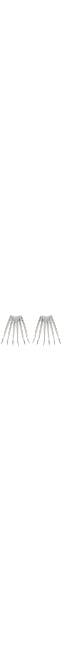 O brinco prateado é produzido em metal com banho de prata 950. A peça possui tamanho médio, tiras finas curvadas, afunilado na parte superior, acabamento polido e fechamento por tarraxa.