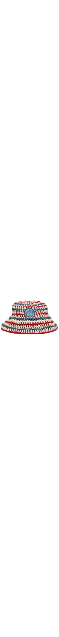 O bucket azul é produzido em crochet. A peça de modelo bucket hat* possui aba média, tag da marca aplicada na parte frontal e padronagem de listras em cores contrastantes.