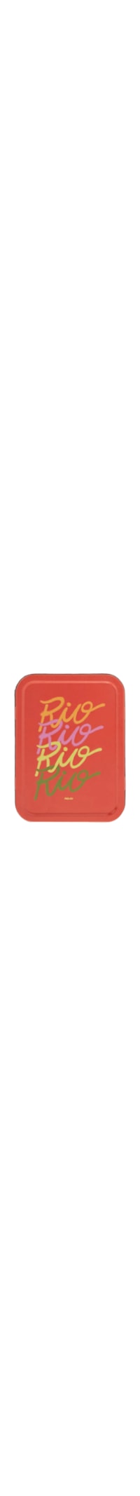 A caixa laranja é produzida em metal. A peça possui tamanho pequeno, formato retangular, estampa figurativa escrita em cores contrastantes na parte superior e fechamento por tampa removível.