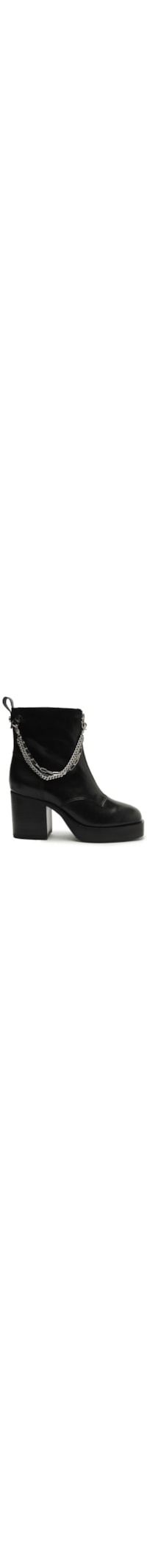 A bota preta é produzida em couro. A peça possui bico arredondado, cano médio, recortes laterais e posterior, puxador posterior, salto médio de modelo bloco, solado emborrachado, aplicação de correntes e fechamento frontal por zíper com puxador.