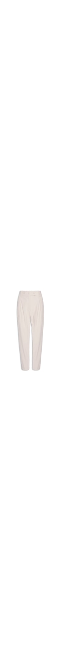 A calça bege é confeccionada em sarja. A peça possui cintura alta, cós com passantes aplicados, bolsos frontais, bolsos decorativos na parte posterior, detalhe de pregas na parte frontal, comprimento longo, shape solto, caimento reto, acabamento pespontado e fechamento frontal por zíper e botões de pressão.