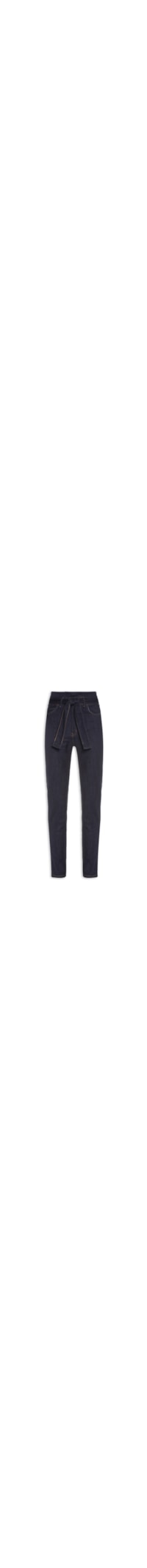 A calça azul é confeccionada em sarja com lavagem jeans. A peça possui cintura alta, cós com passantes aplicados, bolsos frontais, aplique metalizado aplicado no bolso frontal, bolsos posteriores decorativos, nome da marca aplicado na parte posterior, comprimento longo, shape solto, caimento reto, acabamento pespontado e fechamento frontal por botão e zíper. Acompanha faixa na mesma cor e tecido para uso opcional.