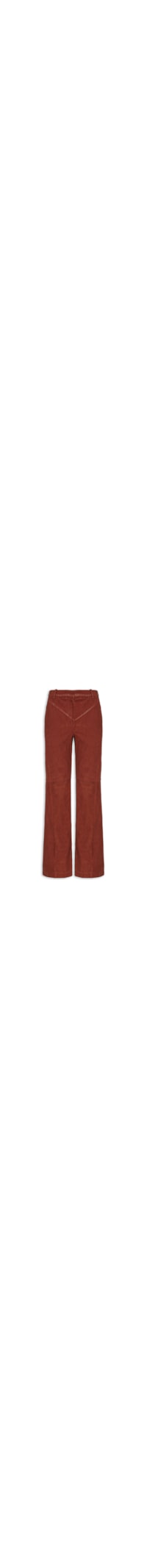 A calça vermelha é confeccionada em chamois sem elasticidade. A peça solta ao corpo possui cintura baixa, cós com passantes, recorte posterior, bolsos frontais e posteriores, detalhe de cordão trançado de couro bordado por toda a peça, comprimento longo, forro e fechamento frontal por colchete e zíper.