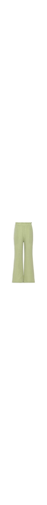 A calça verde é confeccionada em tecido leve sem elasticidade. A peça solta ao corpo possui cintura alta, cós com elástico, bolsos frontais modelo faca e comprimento longo.