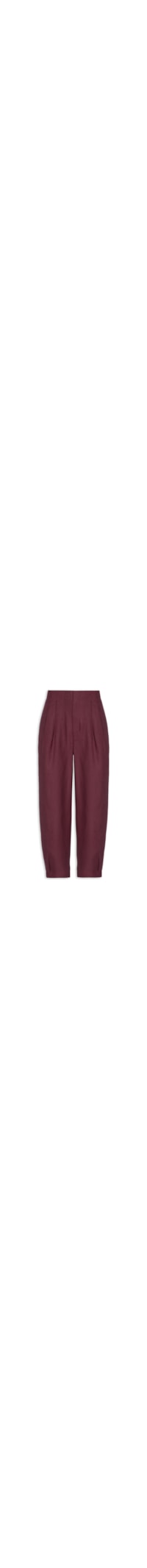 A calça vinho é confeccionada em linho sem elasticidade. A peça solta ao corpo, possui cintura alta, cós com elástico embutido na parte posterior, pregas frontais, bolsos frontais embutidos, bolsos posteriores embutidos, pregas na barra, comprimento cropped* e fechamento frontal por zíper, colchetes e botão interno.