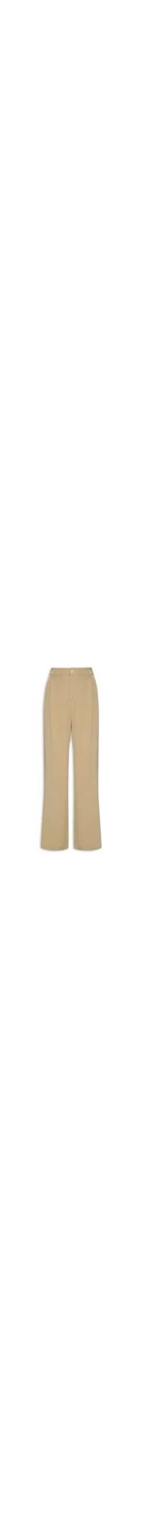 A calça bege é confeccionada em tecido leve sem elasticidade. A peça solta ao corpo, de modelagem reta, possui cintura alta, cós com passantes aplicados, pregas frontais, bolsos faca frontais, bolsos posteriores decorativos embutidos, comprimento longo e fechamento frontal por zíper e botão.