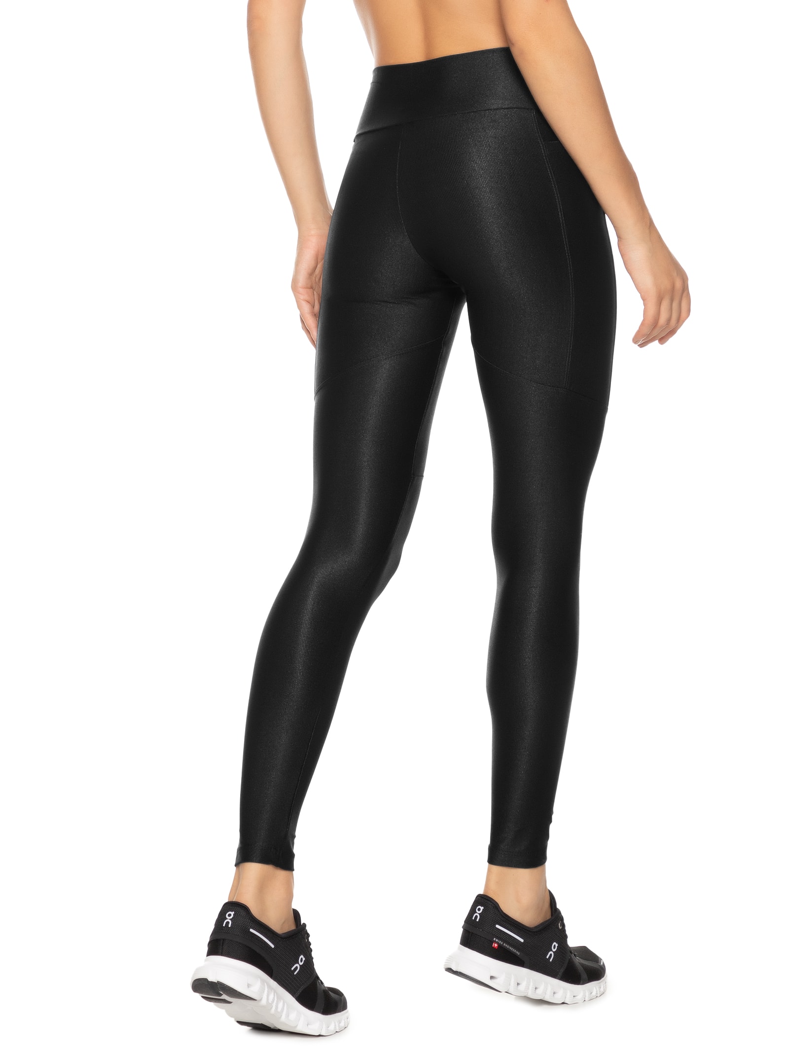A calça preta é confeccionada em malha de poliamida com alta elasticidade. A peça justa ao corpo de modelo legging* possui cintura alta, cós amplo, recortes frontais e posteriores e comprimento longo.