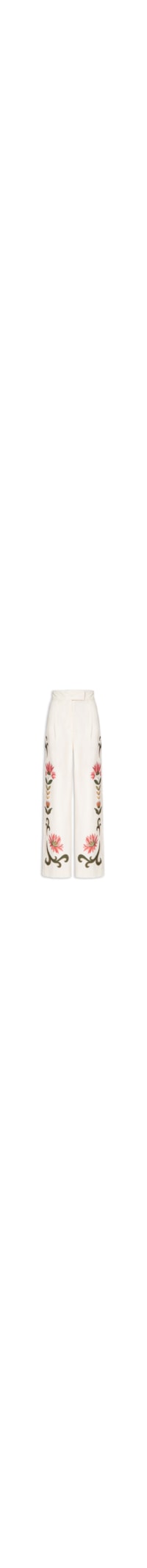 A calça bege é confeccionada em tecido leve com toque de linho sem elasticidade. A peça solta ao corpo possui cintura alta, bolsos frontais embutidos, pregas frontais e pences posteriores, bolso posterior decorativo, estampa floral em cores contrastantes, comprimento longo e fechamento frontal por botão, colchetes e zíper.