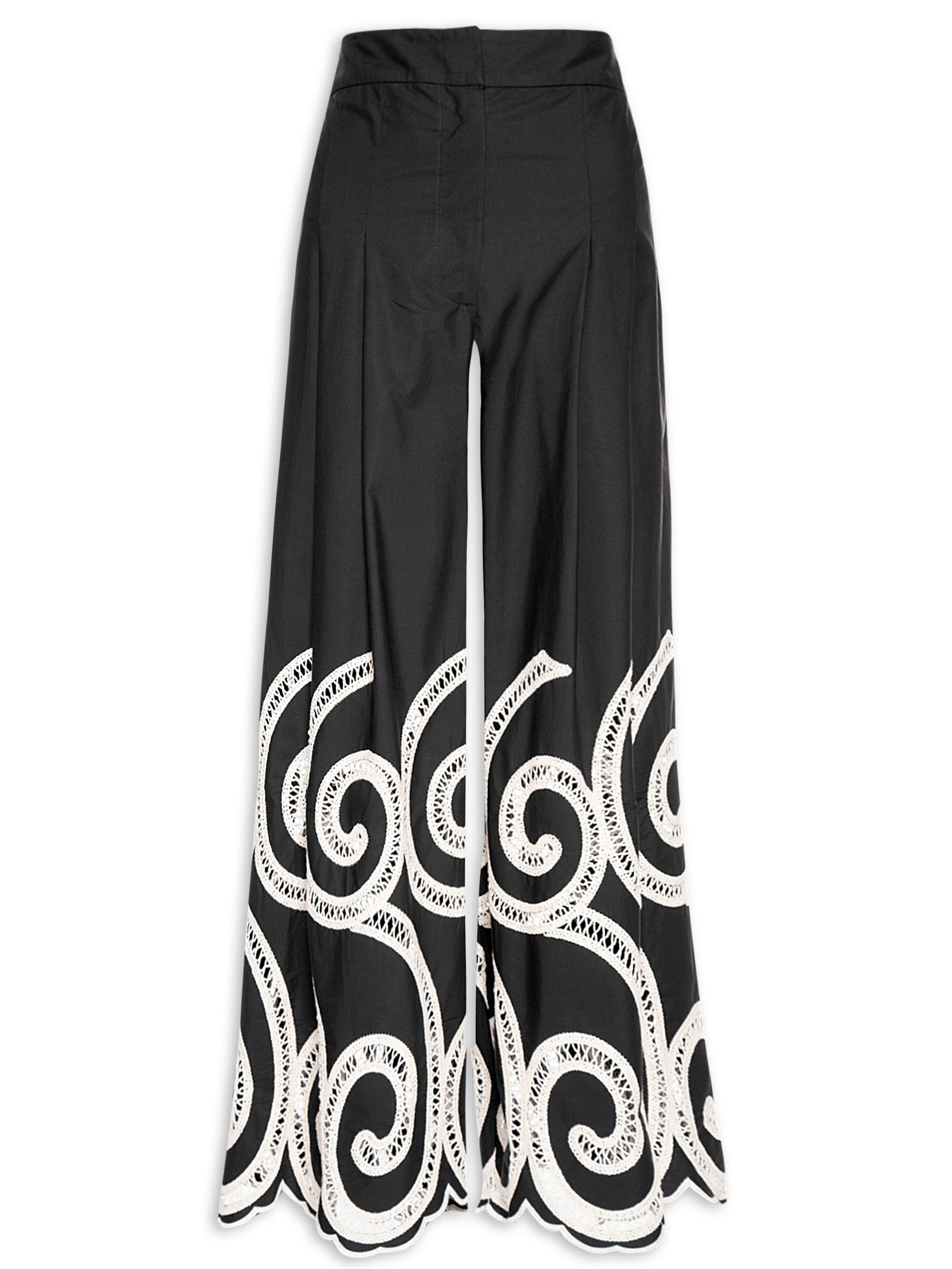 A calça preta é confeccionada em tecido leve sem elasticidade. A peça solta ao corpo possui cintura alta, pences posteriores, pregas frontais, bordado richelieu na cor bege nas partes posterior e frontal, comprimento longo, barra com acabamento nuvem e fechamento frontal por botão, colchete e zíper.