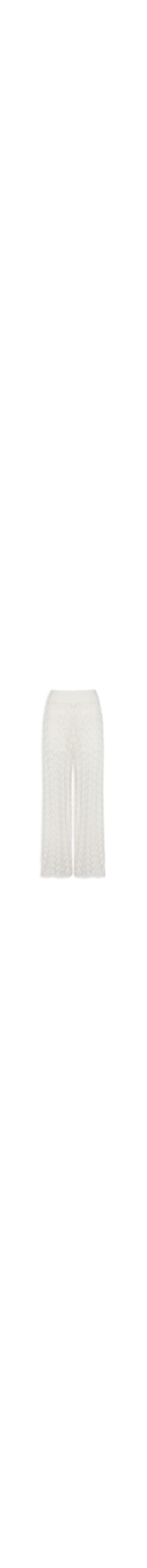 A calça branca é confeccionada em tricot de média elasticidade. A peça solta ao corpo, possui cintura alta, cós largo com elástico embutido, padronagem com trama aberta, leve transparência, barra ondulada, comprimento longo, e meio forro.