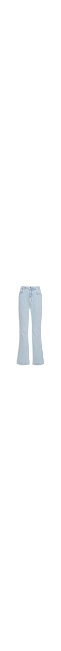A calça azul é confeccionada em tecido de sarja de algodão com lavagem jeans sem elasticidade. A peça justa ao corpo possui modelo flare* de cintura alta, cós com passantes aplicados, five pockets**, tag de couro da marca aplicada à parte posterior do cós, comprimento longo, barra alongada, sem forro, fechamento frontal por zíper e botão.