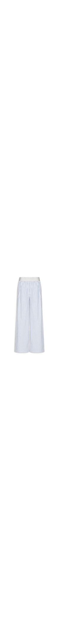 A calça azul é confeccionada em malha de algodão sem elasticidade. A peça solta ao corpo possui cintura média, cós com elástico, bolsos frontais modelo faca, bolso posterior com botão, padronagem de listras em cor contrastante e comprimento longo.