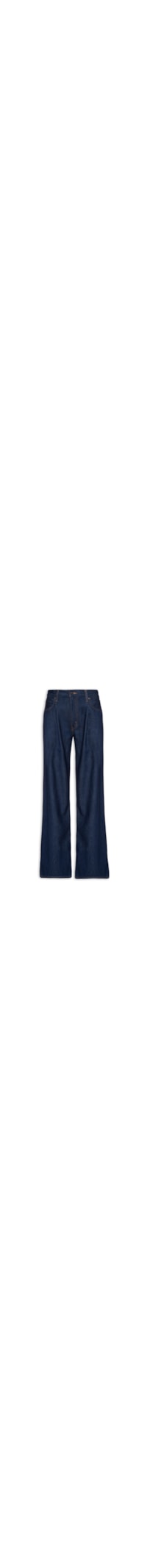 A calça azul é confeccionada em sarja com lavagem jeans e sem elasticidade. A peça de modelo wide leg* solta ao corpo possui cintura alta, cós com passantes e tag da marca aplicada na parte posterior, recorte posterior, five pockets** com detalhe de rebites nos bolsos frontais, tag da marca aplicada no bolso posterior, pregas frontais, comprimento longo e fechamento frontal por botão e zíper.