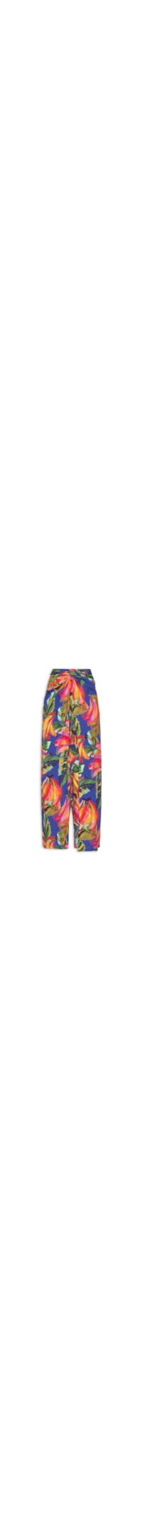 A calça azul é confeccionada em tecido leve sem elasticidade. A peça solta ao corpo possui cintura alta, detalhe de sobreposição frontal com faixas alongadas, mix de estampas em cores contrastantes, comprimento longo e fechamento posterior por amarração.