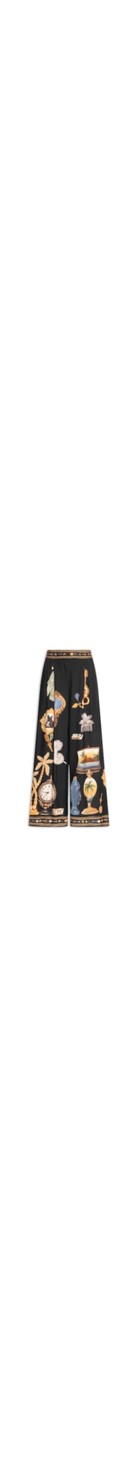 A calça preta é confeccionada em tecido leve sem elasticidade. A peça solta ao corpo possui cintura alta, cós com elástico embutido na parte posterior, pregas frontais, mix de estampas em cores contrastantes e comprimento longo.