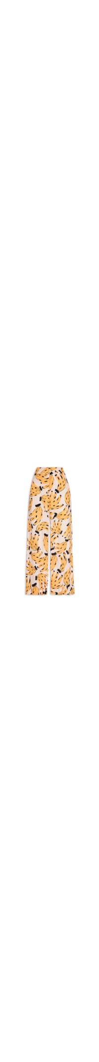 A calça amarela é confeccionada em tecido leve sem elasticidade. A peça solta ao corpo de cintura alta, na parte posterior possui elastico aplicado ao cós, leve franzido, estampa figurtiva de bananas, comprimento longo, barra alongada, sem forro, fechamento frontal por zíper e botão forrado.