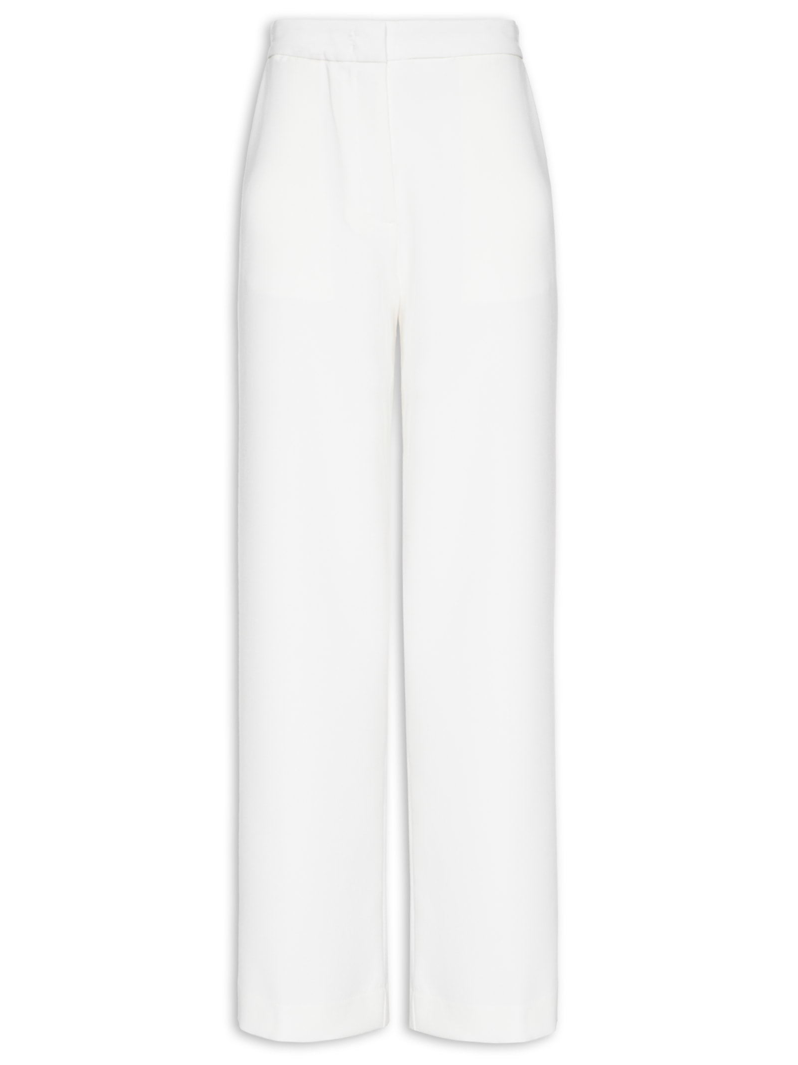 A calça branca é confeccionada em tecido leve com baixa elasticidade. A peça solta ao corpo de modelagem reta possui cintura alta, dois bolsos frontais de modelo faca, dois bolsos posteriores embutidos, comprimento longo, e fechamento frontal por zíper, botão e colchete.