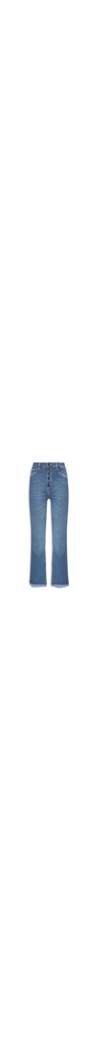 A calça azul é confeccionada em sarja com lavagem em jeans com baica elasticidade. A peça de modelo capri justa ao corpo possui cintura alta, cós com passantes, recorte posterior, five pockets*, efeito estonado, barras desfiadas, comprimento cropped** e fechamento frontal por botões.